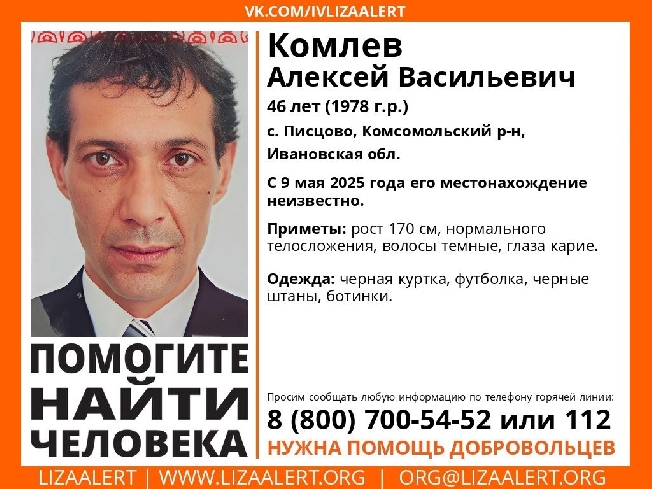Поисковый спасательный отряд «ЛизаАлерт» рассказал об исчезновении 46-летнего жителя села Писцово Комсомольского района.